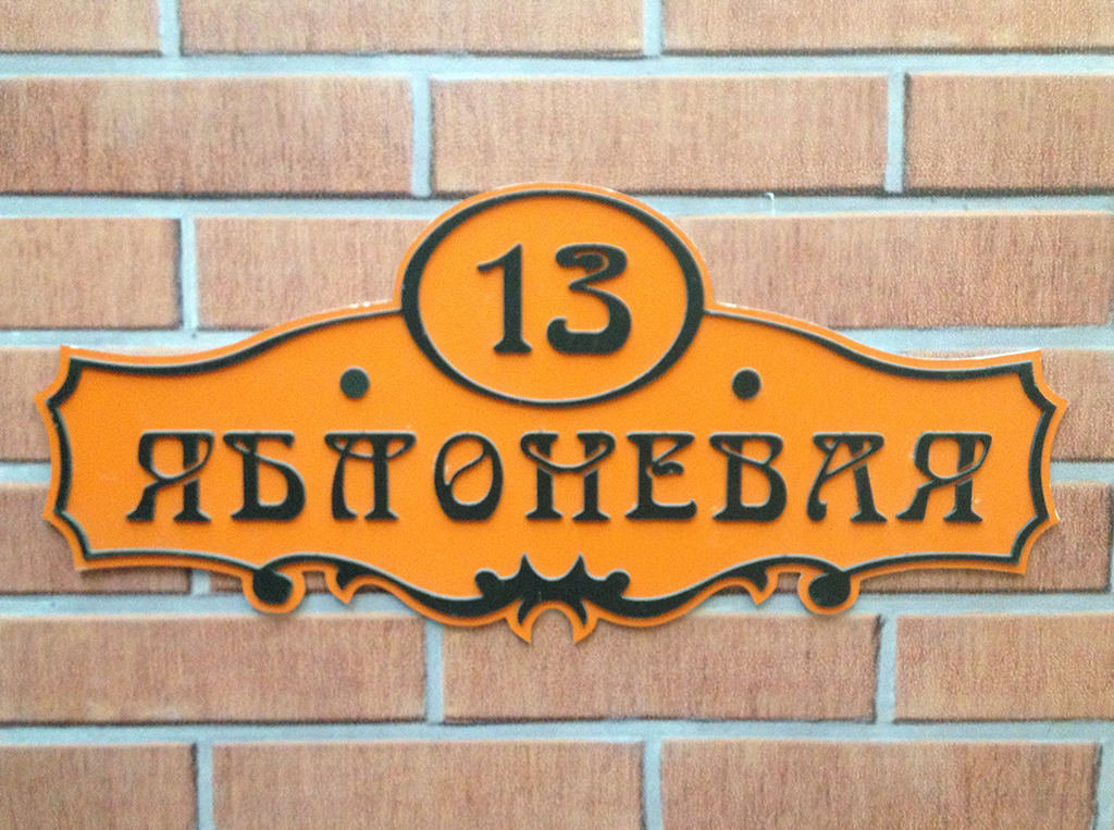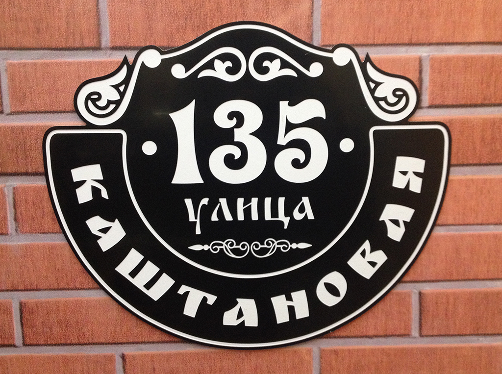 Обратившись к нам, вы получаете уникальный дизайн вашей адресной таблички. Наши дизайнеры помогут подобрать цвет и форму, соответствующие архитектурному стилю вашего дома. Красивые адресные таблички, которые мы разрабатываем и производим на собственном оборудовании, служат долго. Используемые в производстве адресных табличек материалы износостойки к перепадам температуры, влагостойки, поэтому будут долго радовать вас и выделять ваш дом среди других домов. Мы можем выполнить любую надпись и любое изображение на адресной табличке. Вы можете указать и выделить изображением сферу ваших интересов. Мы можем придумать эскиз и воплотить в жизнь любую тему.